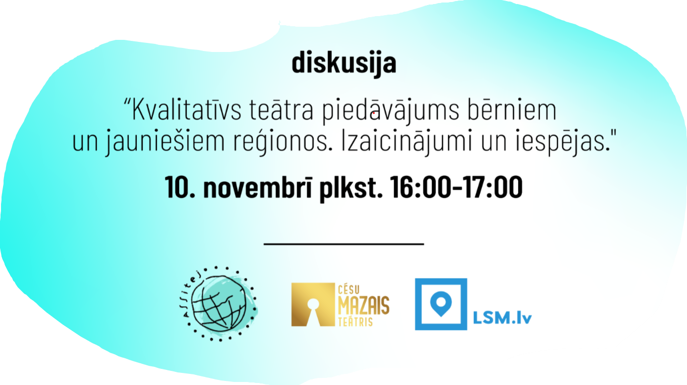 ASSITEJ nacionālais centrs Latvijā aicina uz diskusiju par nevalstisko teātru lomu profesionālā skatuves mākslā bērniem un jauniešiem. Atzīmējot teātra mēnesi ASSITEJ nacionālais centrs Latvijā aicina teātra nozares profesionāļus, kultūras jomas pārstāvjus, vecākus, pedagogus, ikvienu interesentu piedalīties diskusijā “Kvalitatīvs teātra piedāvājums bērniem un jauniešiem reģionos. Izaicinājumi un iespējas”. Diskusijā piedalīsies: Diskusiju vadīs teātra kritiķe un LU Literatūras, folkloras un mākslas institūta pētniece Dita Jonīte. Diskusija klātienē notiks pirmdien, 10. novembrī, no